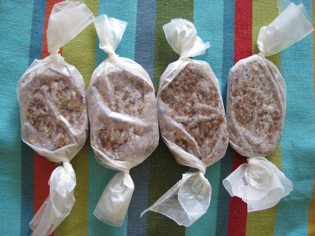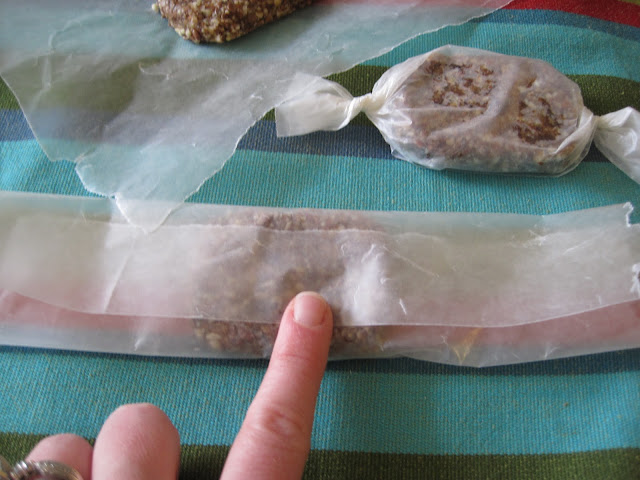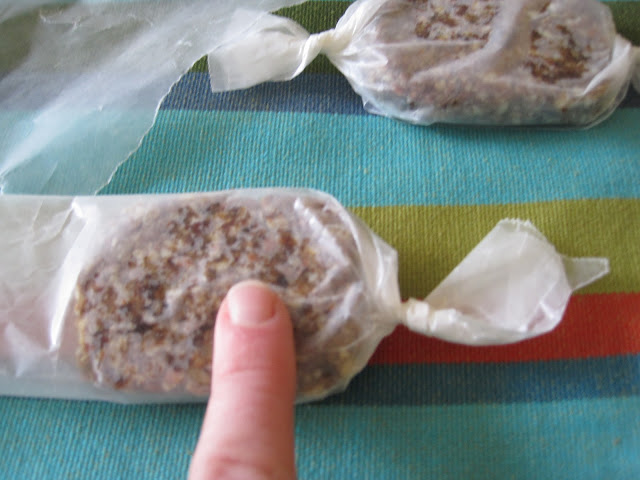 Add the ground nut/flaxseed to the bowl with the dates/raisins and mix thoroughly. I used my hands as I found trying to incorporate everything with a spatula wasn't working out so well. Separate into 4 equal parts, placing each part on a piece of prepared wax paper. If you'd like larger bars only separate the mixture into two parts.